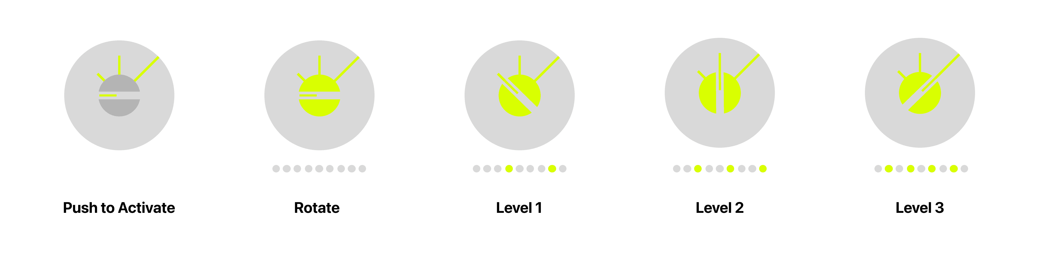Through multiple iterations, I finalized a push-and-rotate interaction. The user must push before rotating, preventing accidental activation, while each level provides a distinct clicking feedback to communicate changes through haptic sensation.