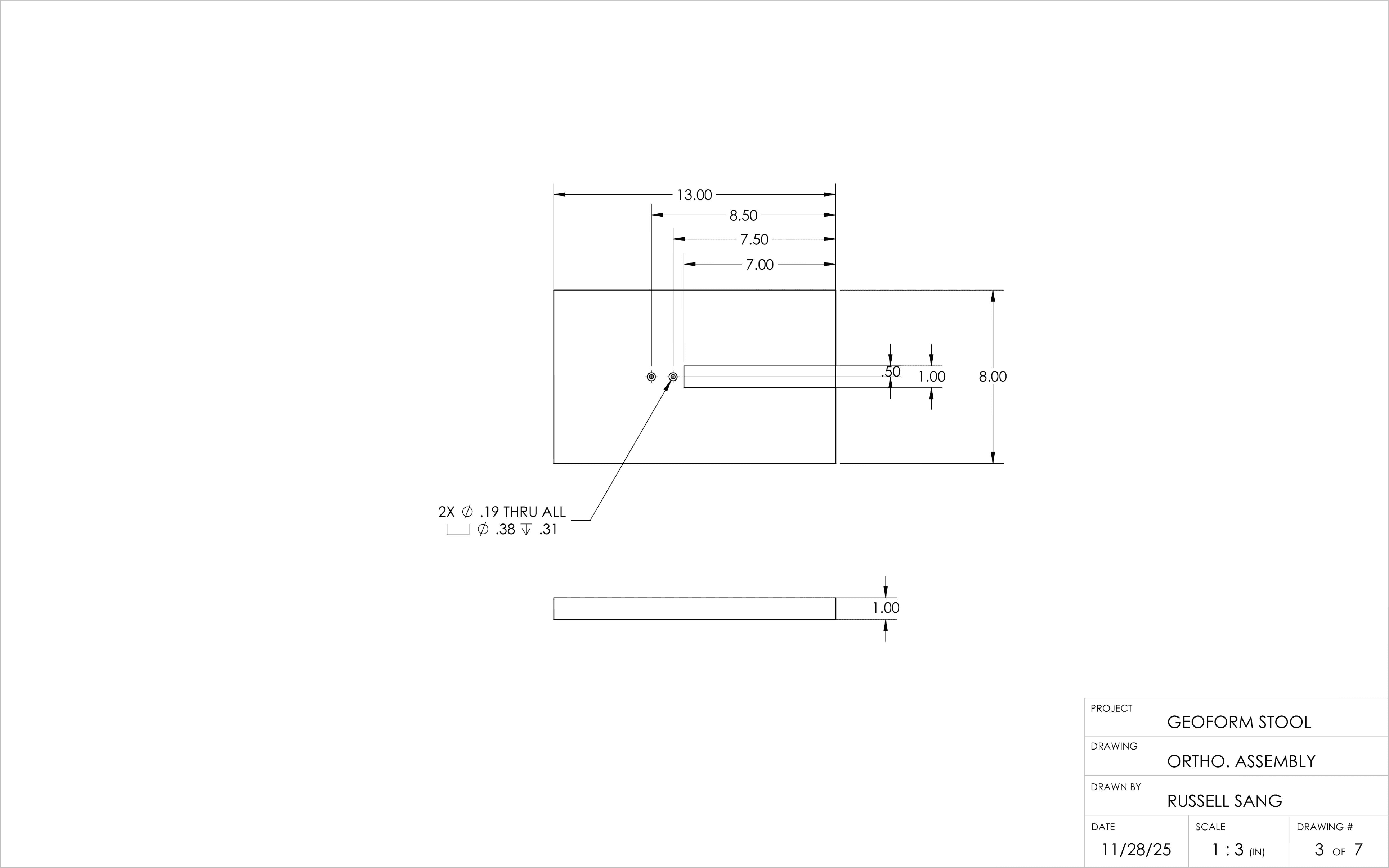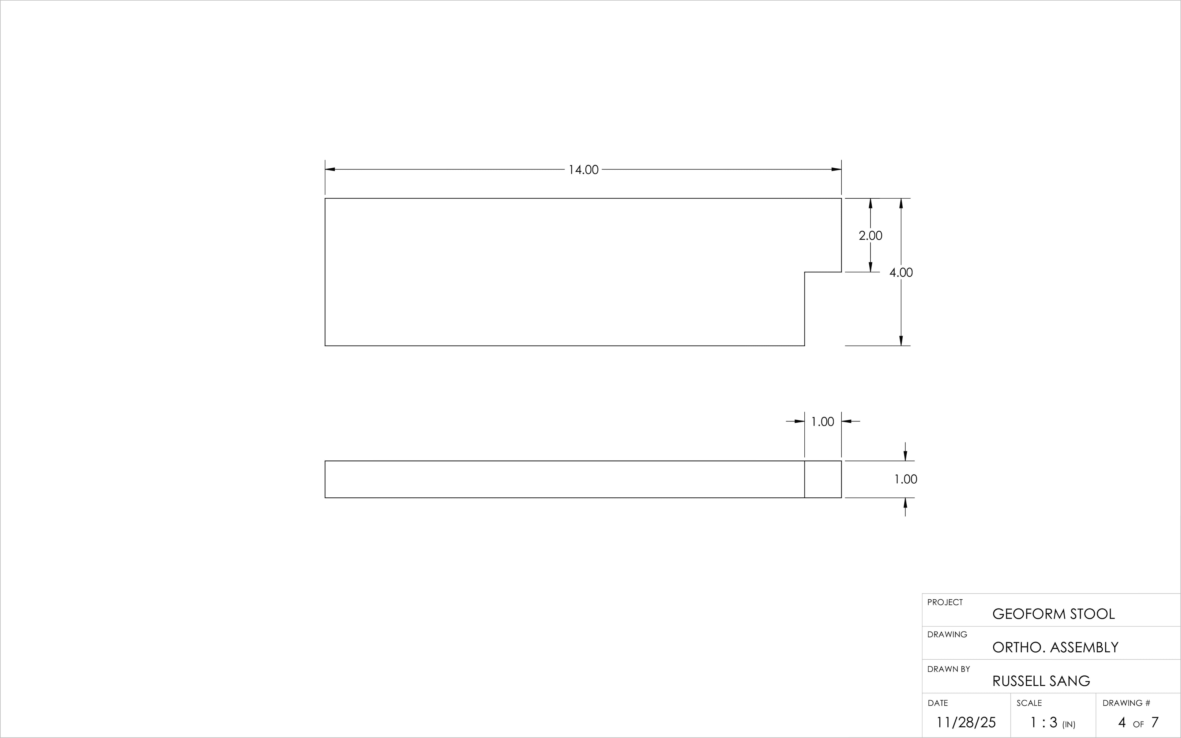 Using 1/4-scale foam board models and dimensional sketches, I transitioned into SolidWorks to define accurate proportions, refine geometry, and produce technical drawings. These drawings guided the fabrication process, helping plan precise dimensions and shapes while coordinating the use of different woodworking machines during the construction of the stool.