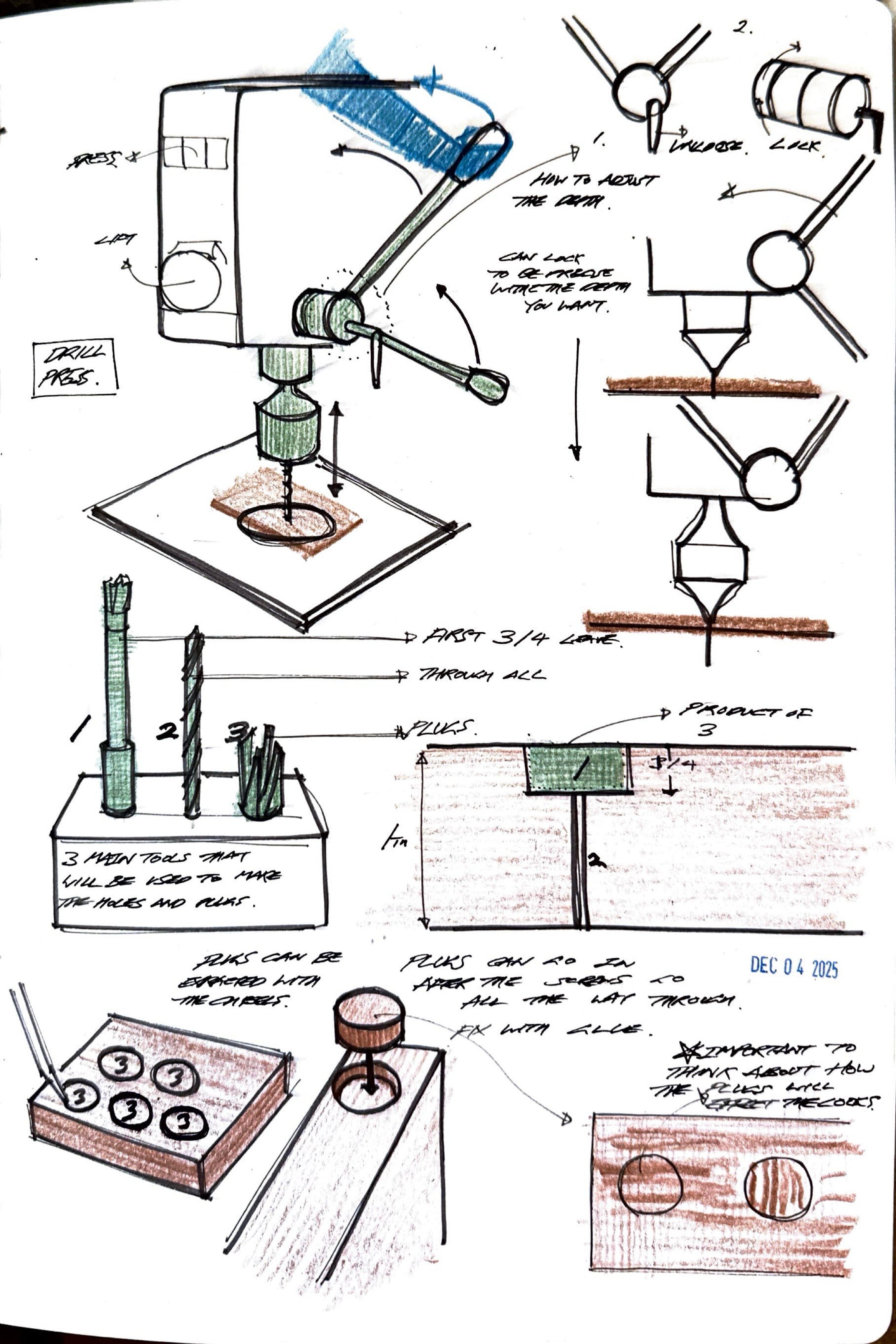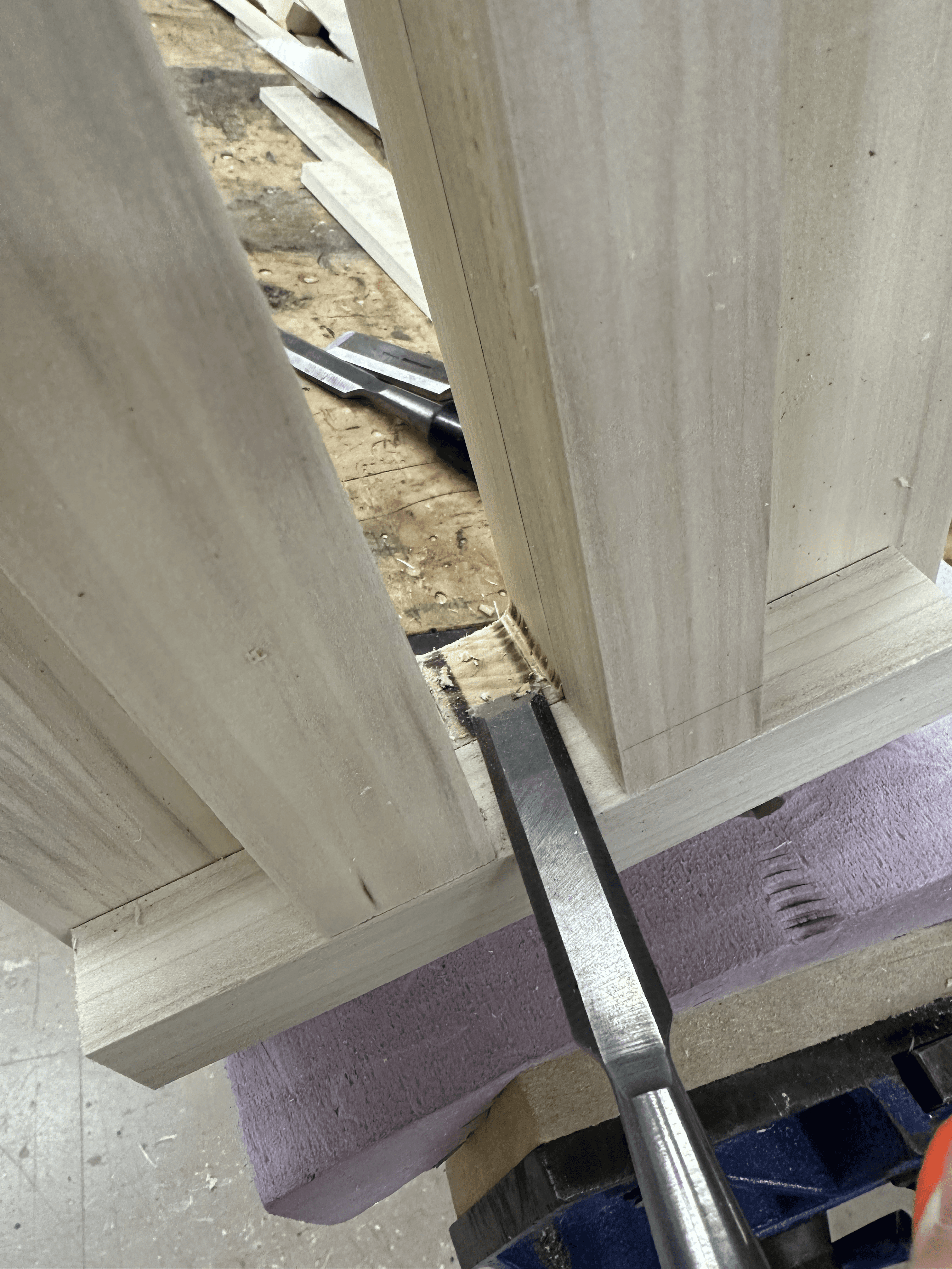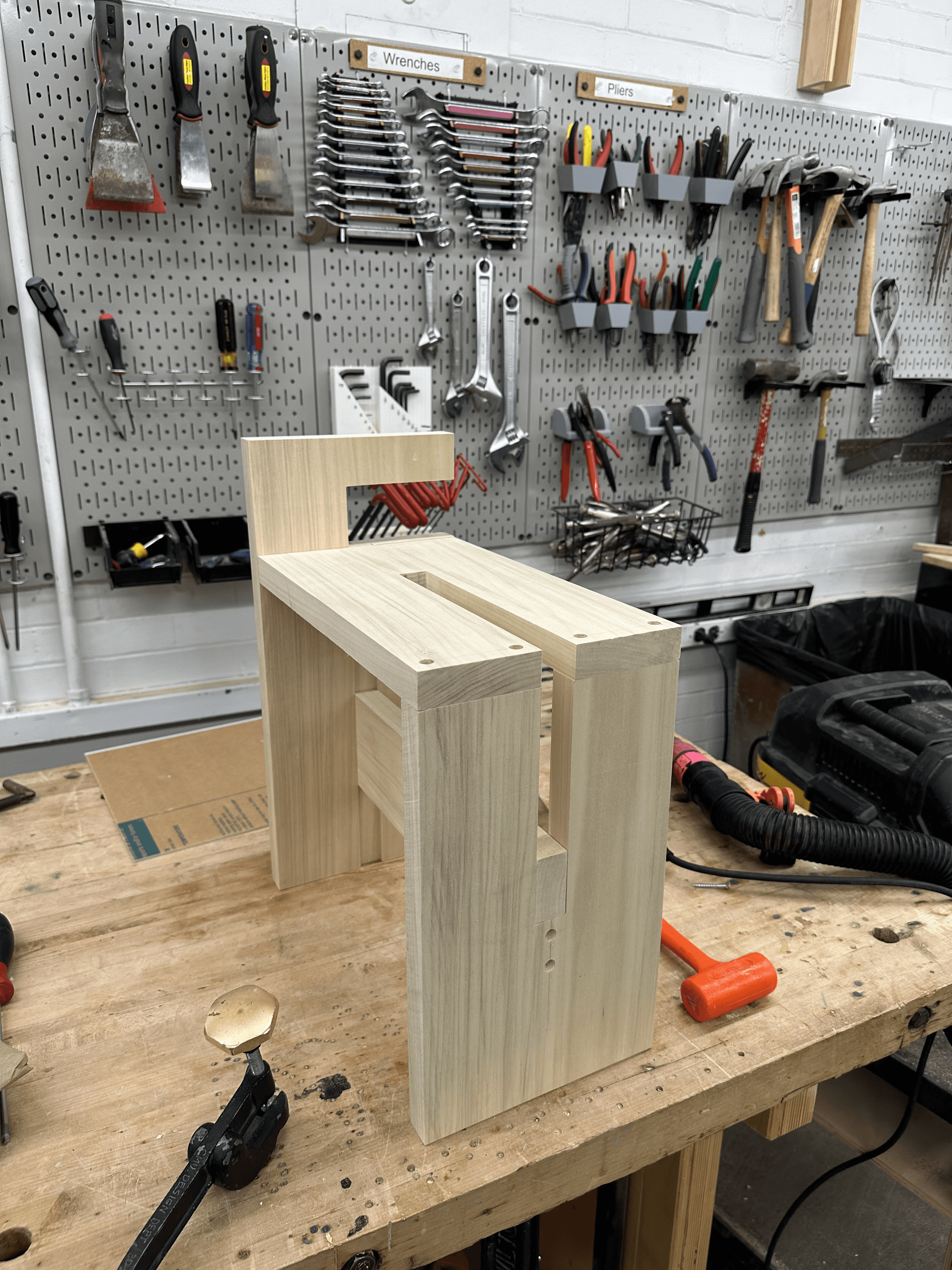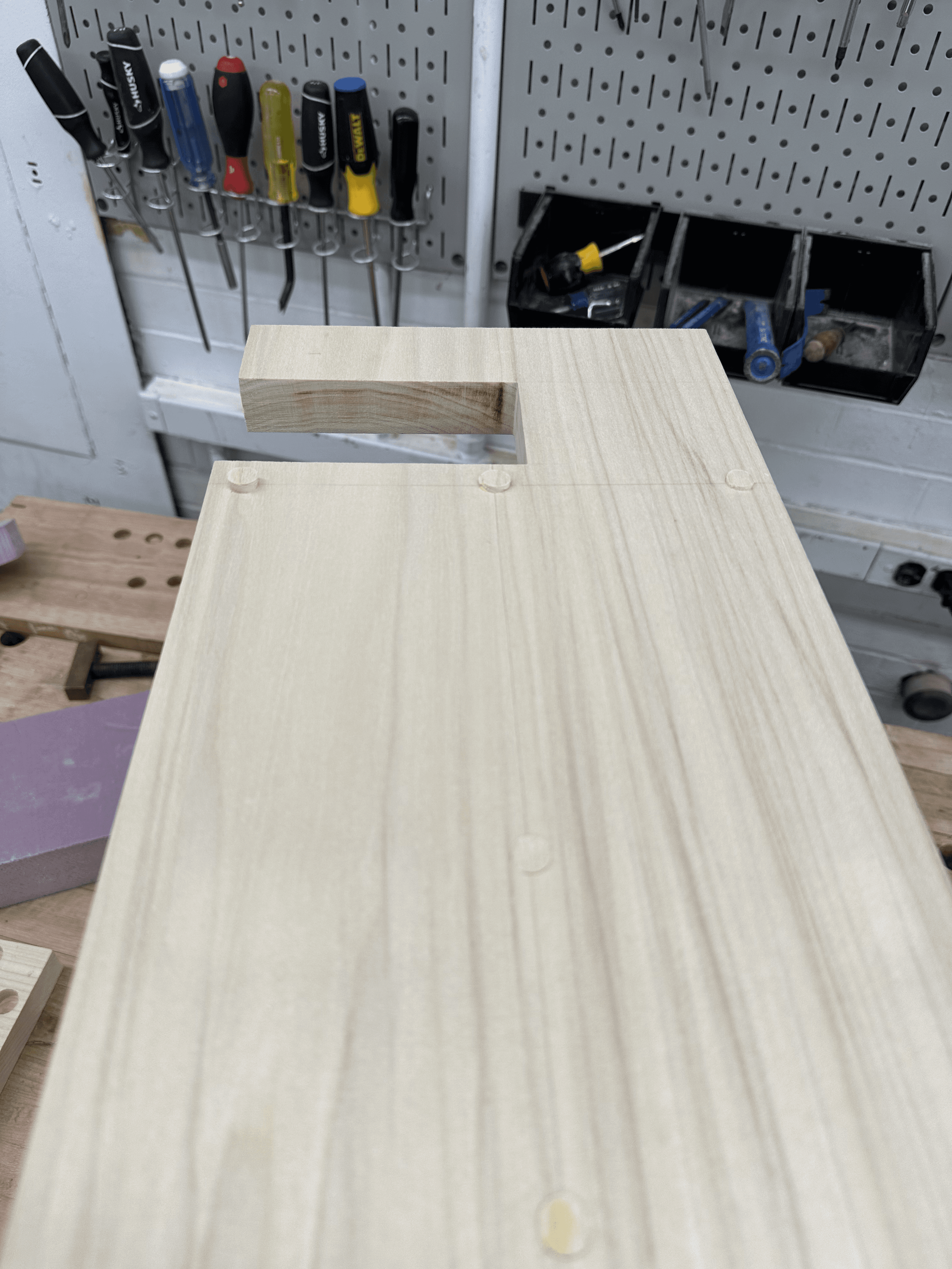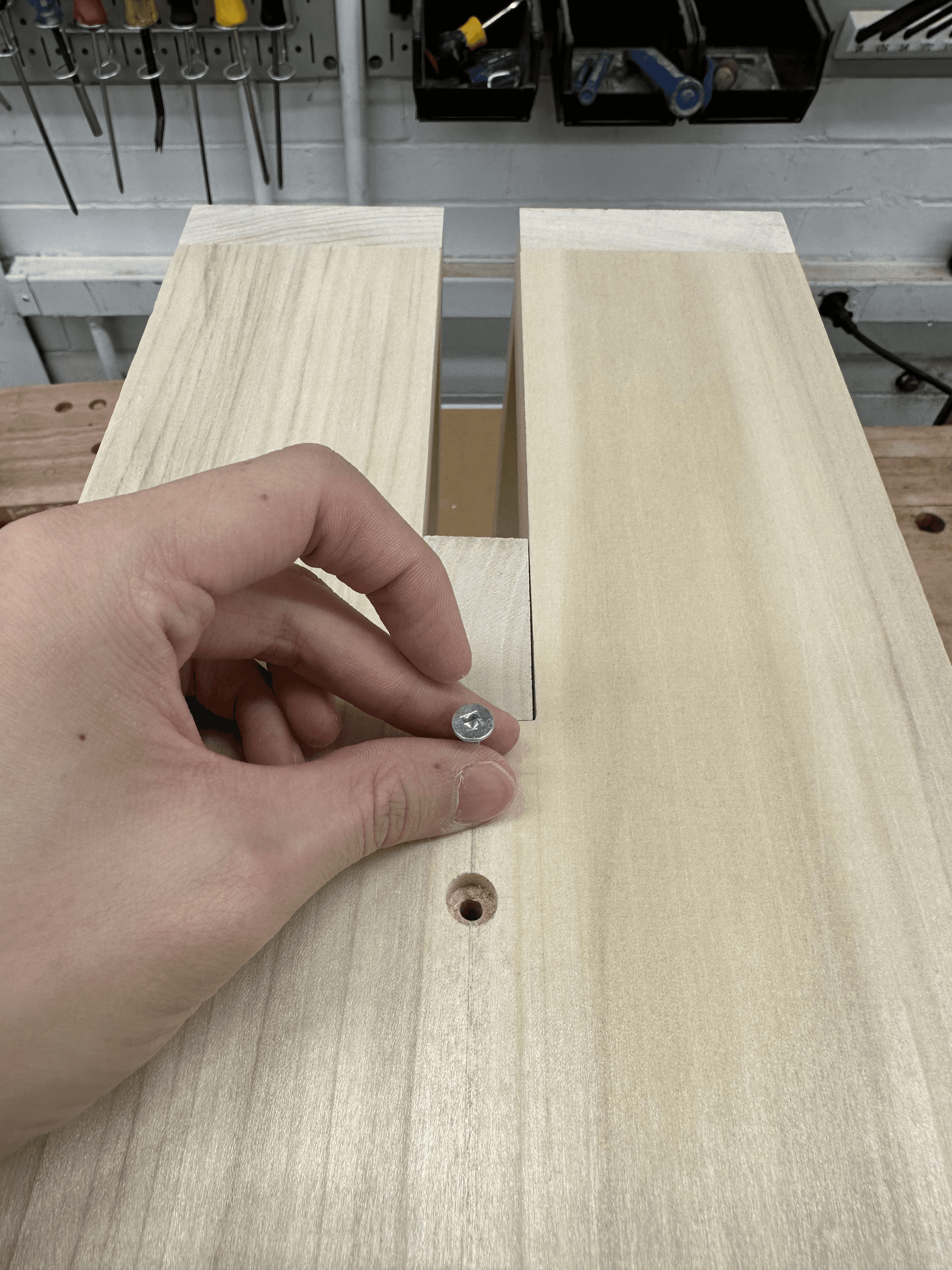 I used chisels to refine areas the router could not reach, ensuring that all corners remained sharp and precisely at 90 degrees. Using a drill press, I then created accurately aligned holes for screws, along with corresponding plug holes to conceal the fasteners and maintain a clean geometric finish.
