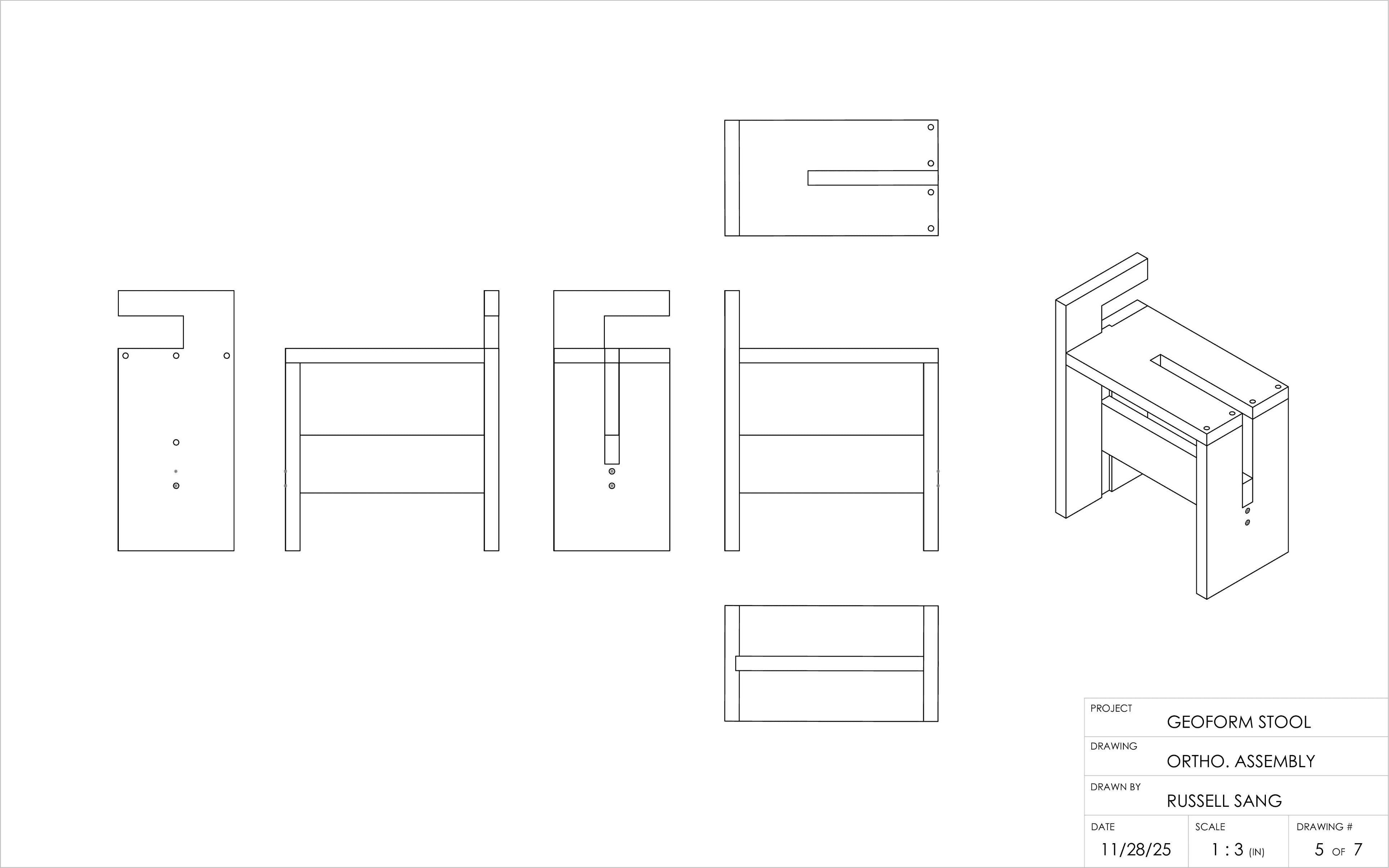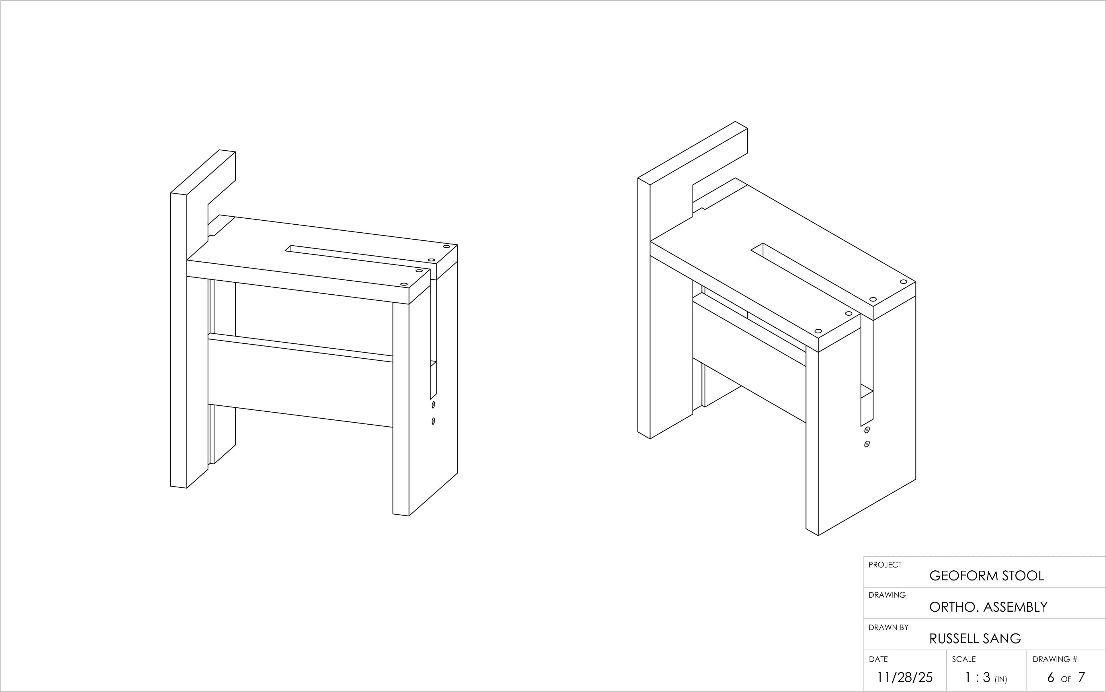 The Geo Form stool explores the concept of geometric form through straight lines and precise 90-degree cuts under strict constraints. Crafted from a single piece of rough poplar lumber(8' X 60' X 1'), the project investigates how an aesthetically balanced and functional form can emerge purely from geometric limitations. By working within restrictions( 4 boards, joints, tools, etc.) the design reveals how structure, usability, and visual clarity can coexist in a minimal, rule-driven form.