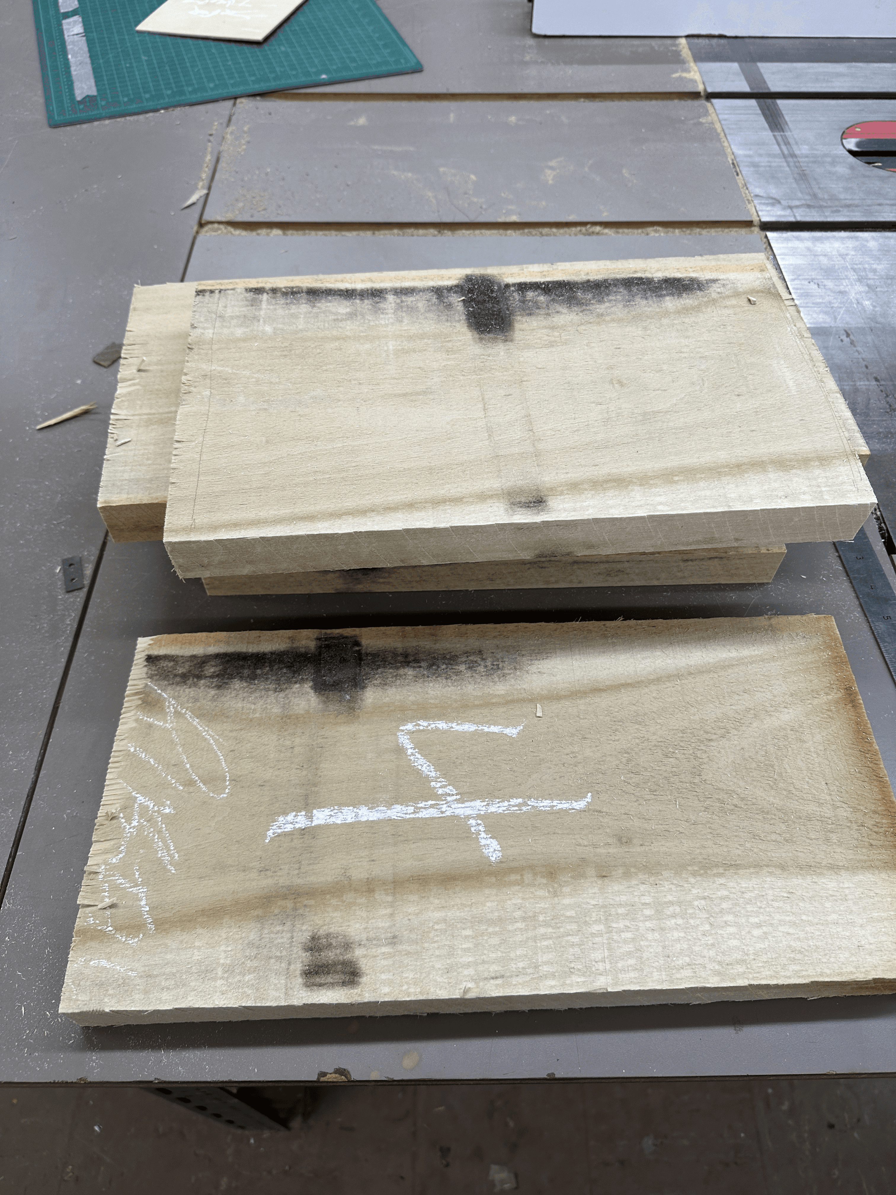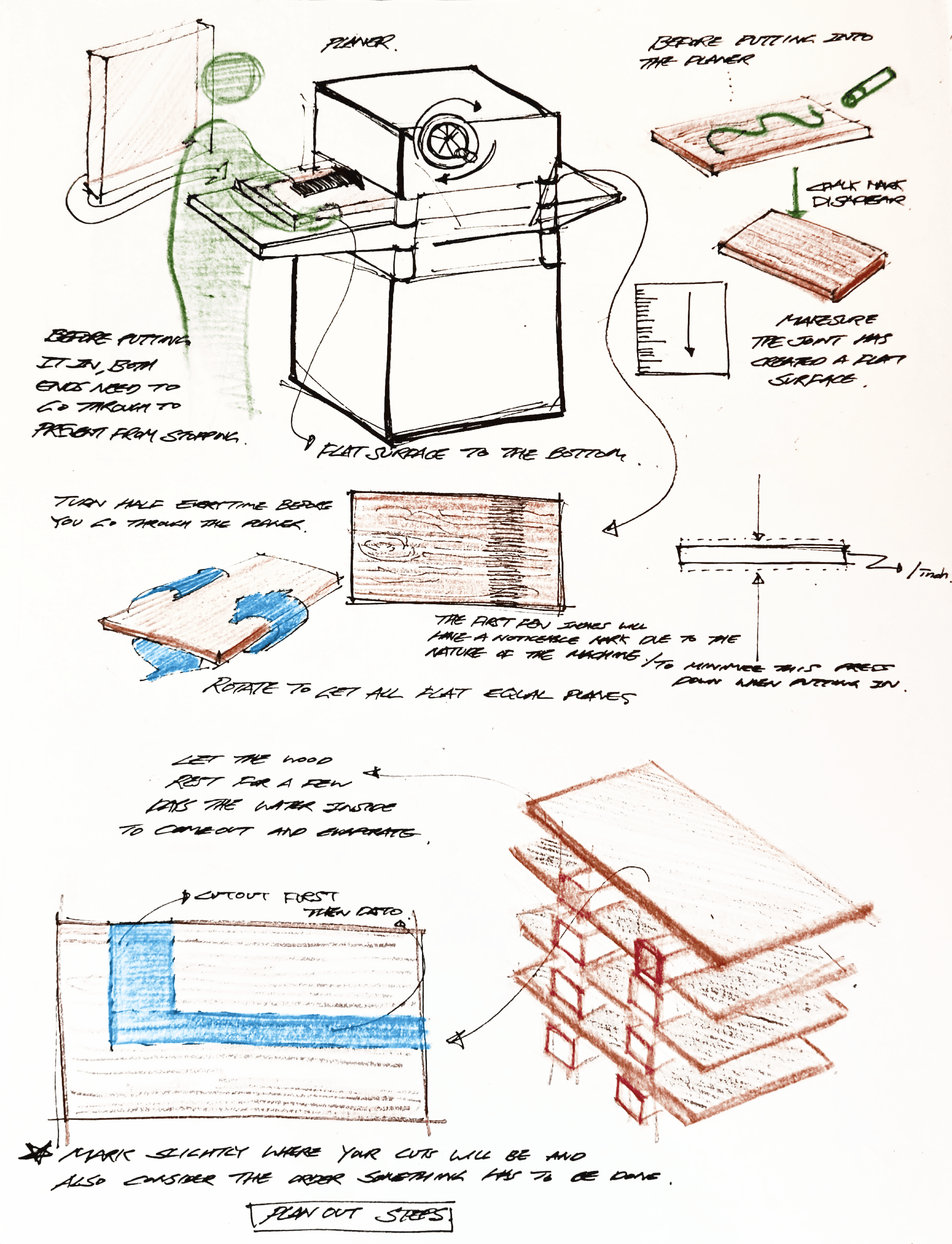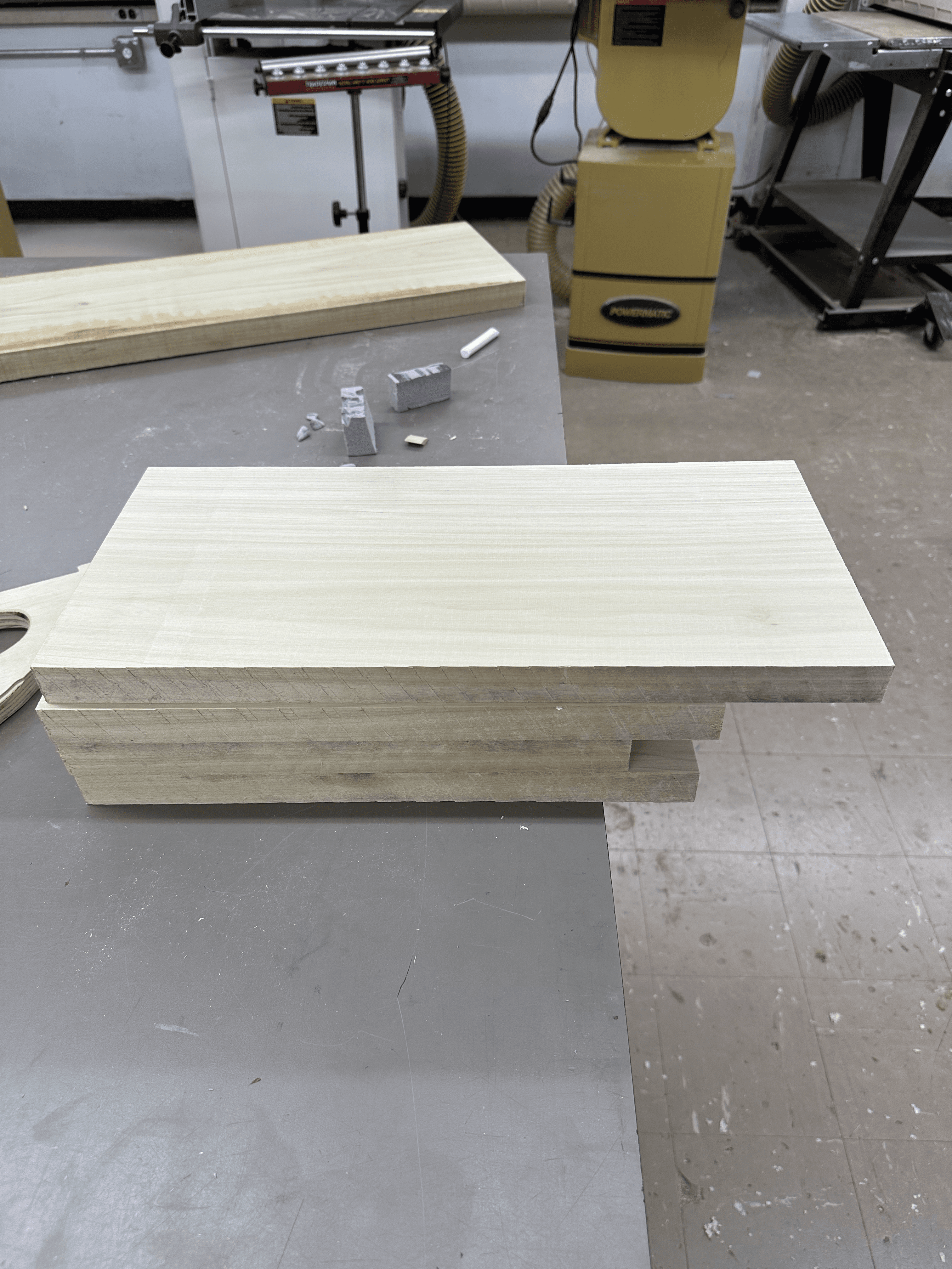 After a week of resting, I used the planer to flatten the surfaces and bring the material closer to final thickness, then marked and cut each piece to its exact dimensions according to the technical drawings.