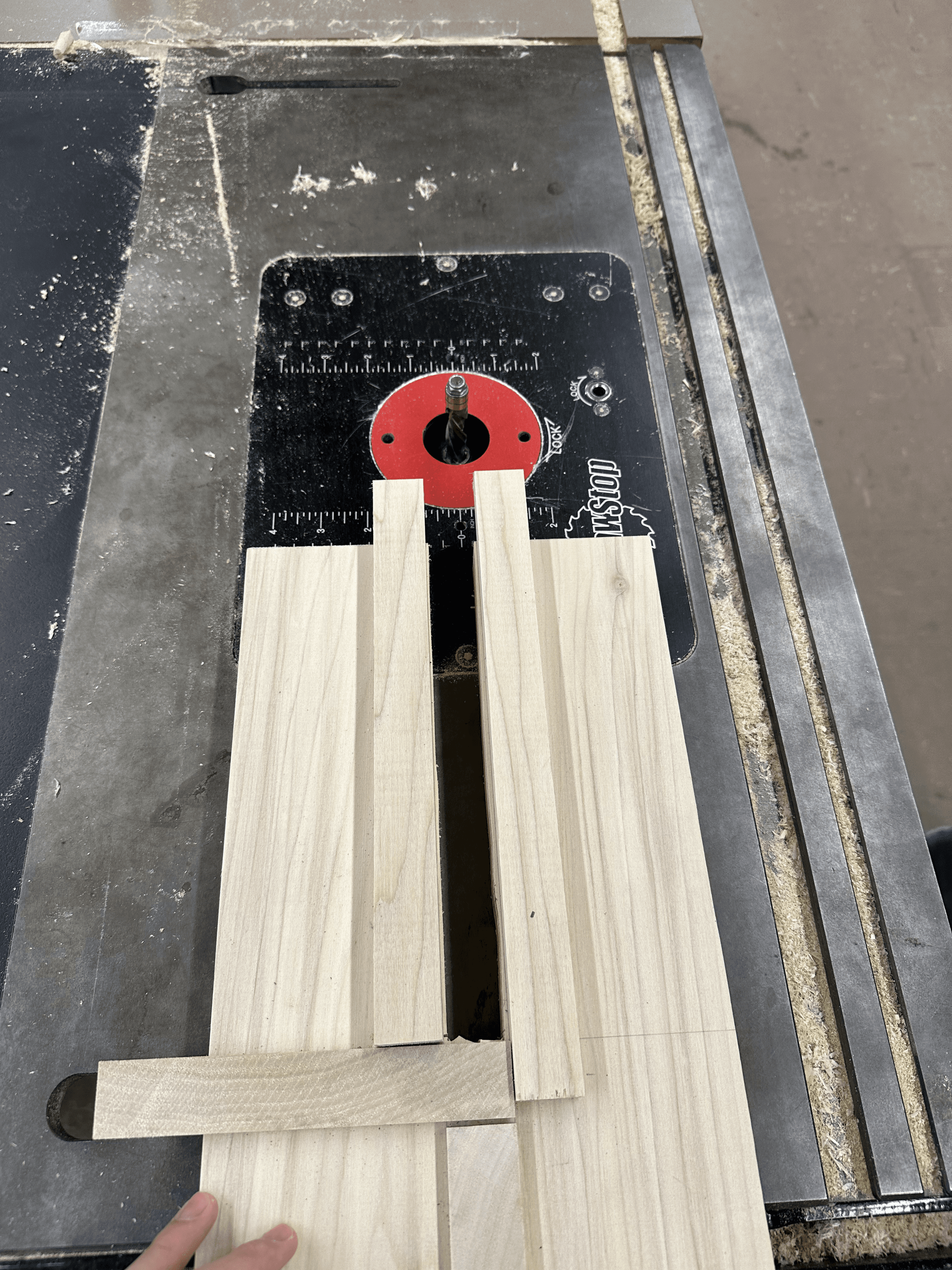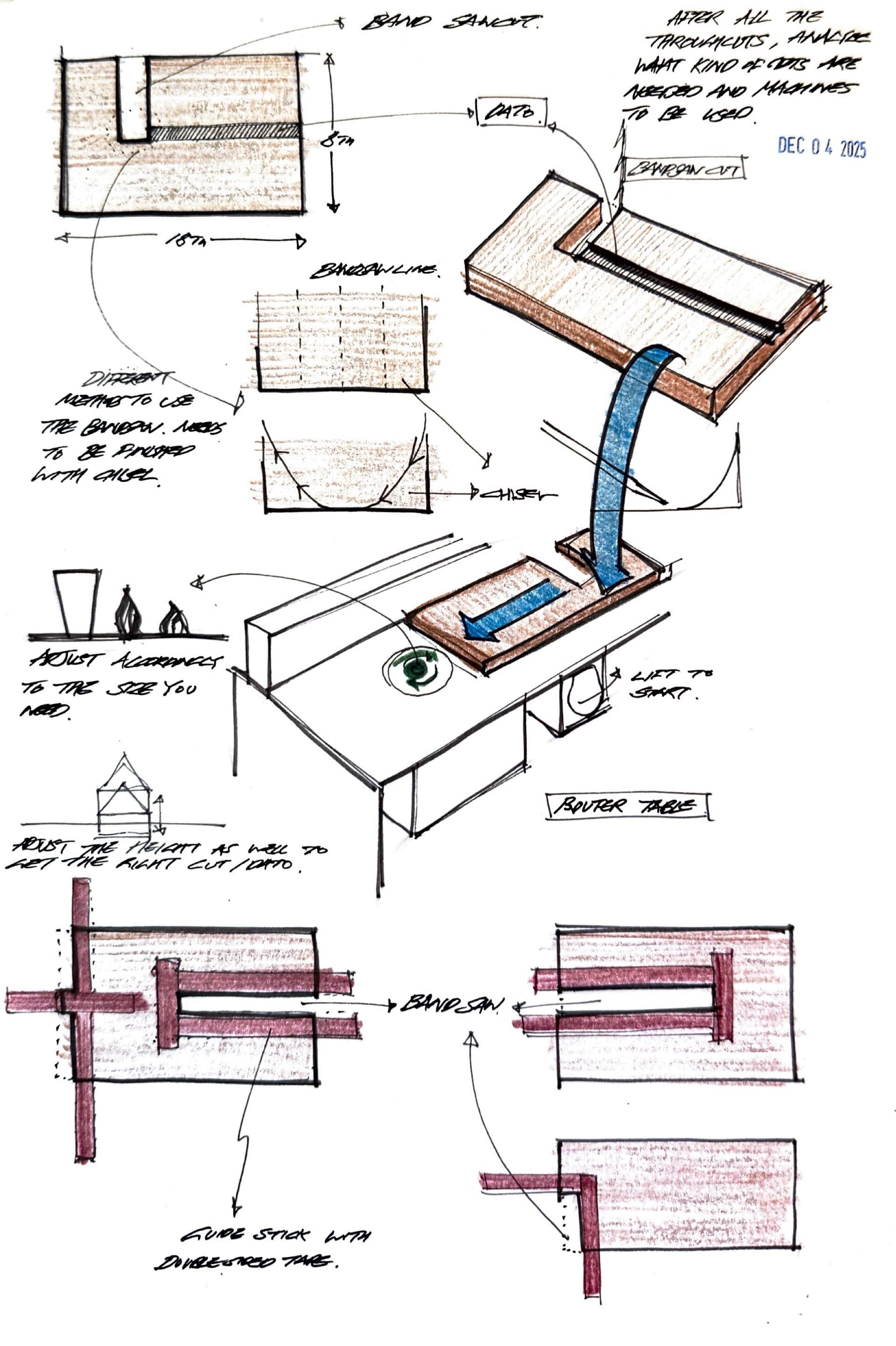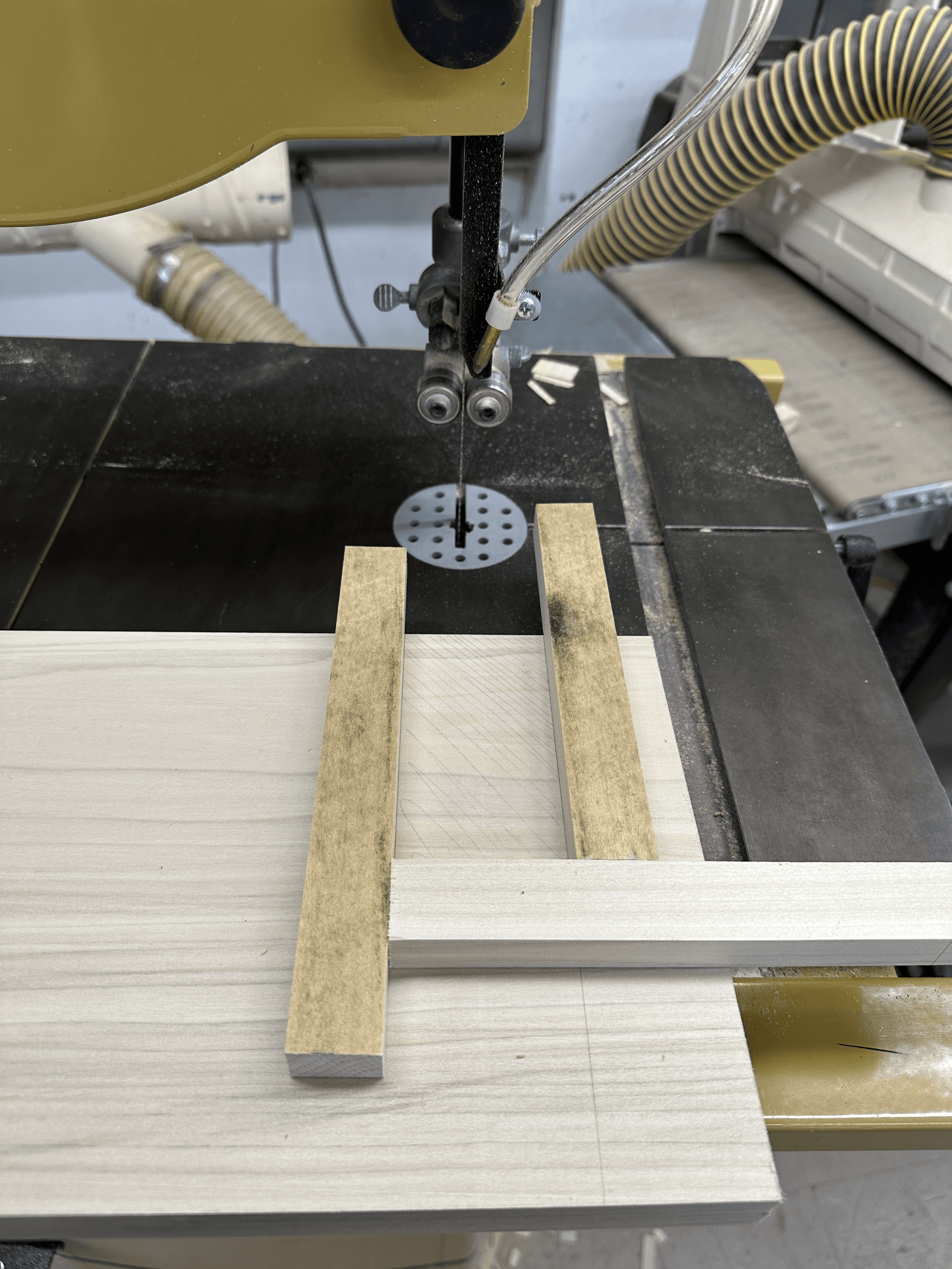 Using the bandsaw, I removed material that could not be cut with the table saw. I then used a router with a guide stick to achieve straight, precise edges, aligning with the project’s geometric intent.