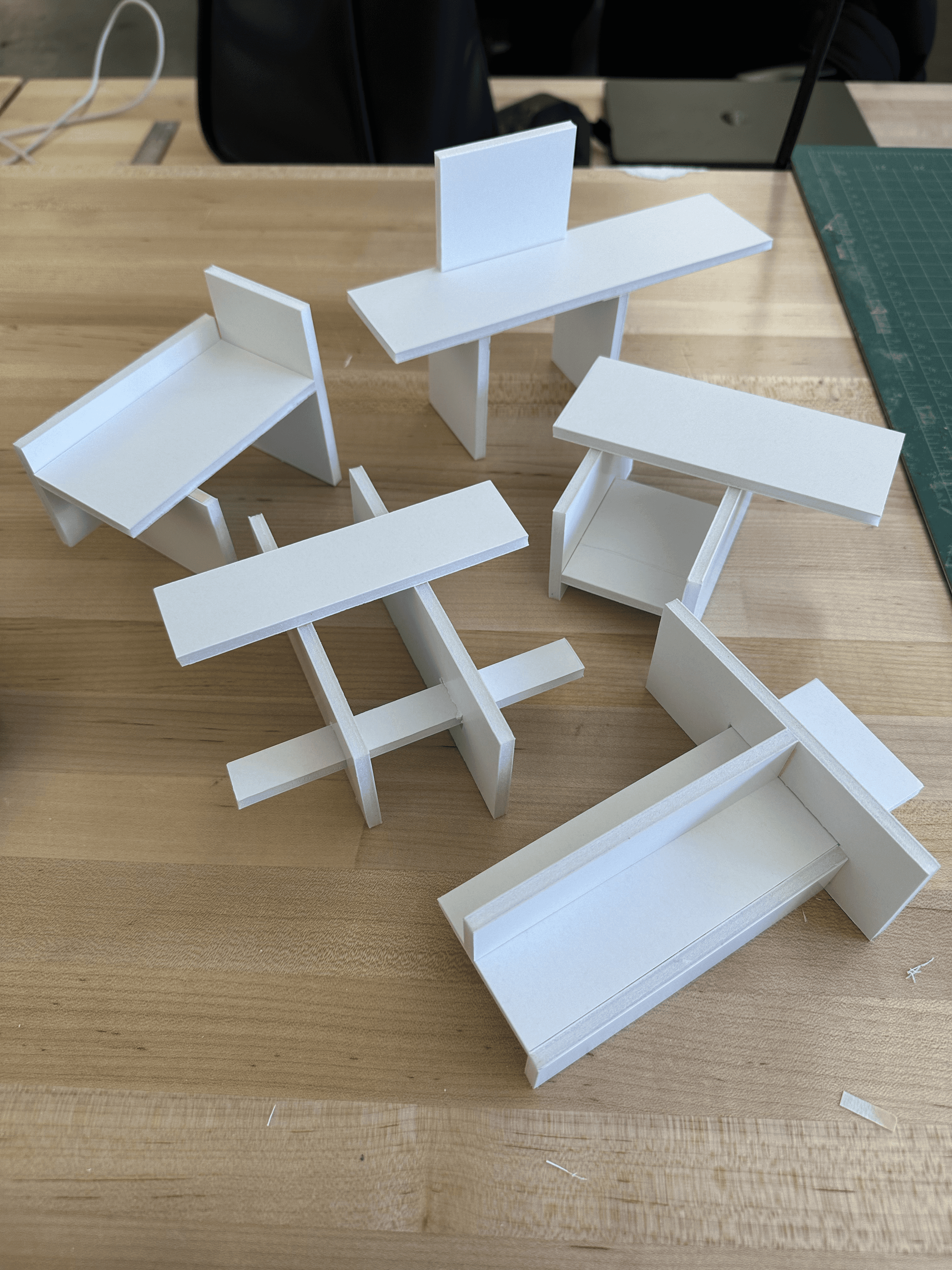 I started the process by building multiple small foam-board prototypes, scaled to one-quarter of the dimensions of the final wooden material.